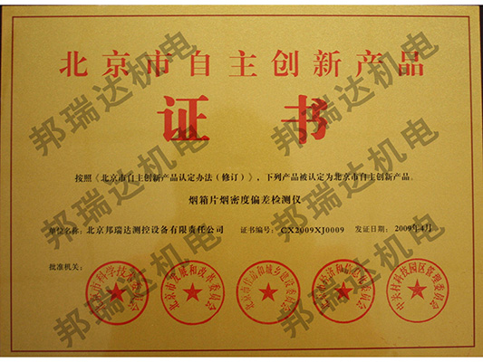 我公司研發的“煙箱片煙密度偏差檢測儀”獲得了北京市自主創新產品證書