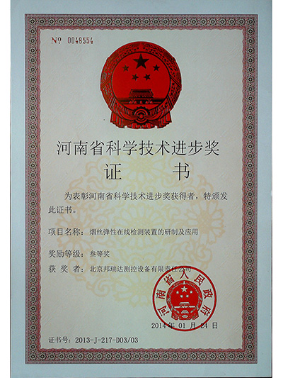 我公司自主研發的“煙絲彈性在線檢測裝置”獲得了河南省科學進步三等獎